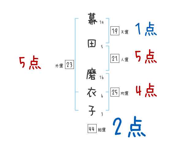 人運![]() | 幕田磨衣子さんの人運は21画の5つ星!統率力がある。独立し成功する。名誉を手に入れる。 性格や才能などを表す2番目に重要な運勢です。人間関係や協調性、社会的な成功に影響します。主に20歳から50歳ぐらいまでの中年期の運勢を表します。 |