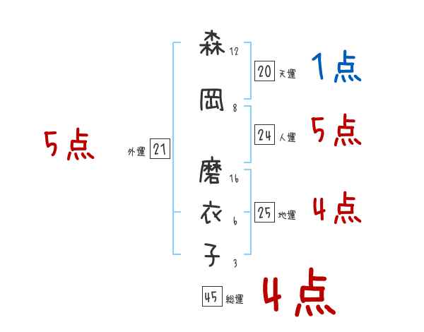 総運![]() | 森岡磨衣子さんの総運は45画の4つ星!もくもくと物事を進め達成する。地味な努力家。 あなたの人生を表す1番重要な運勢です。生涯を通じて影響する総合運となり、主に50歳以降の晩年期に影響を及ぼします。 |