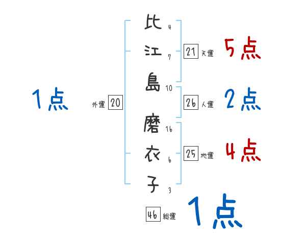 人運![]() | 比江島磨衣子さんの人運は26画の2つ星!波瀾万丈かも。信頼できる人を大事にしましょう。 性格や才能などを表す2番目に重要な運勢です。人間関係や協調性、社会的な成功に影響します。主に20歳から50歳ぐらいまでの中年期の運勢を表します。 |
