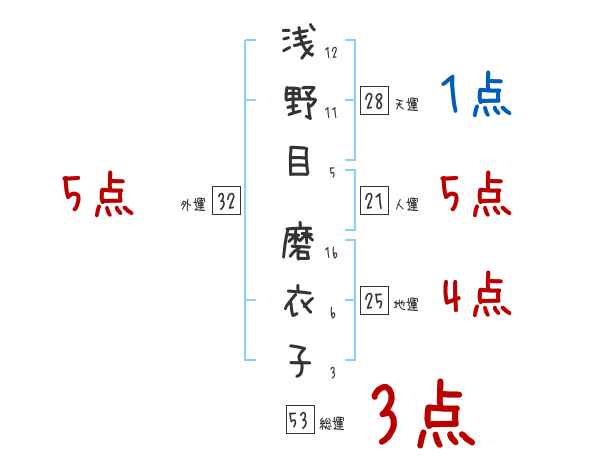 外運![]() | 浅野目磨衣子さんの外運は32画の5つ星!柔軟性があり成功する。チャンスが多く金運が良い。 生活面を象徴する運勢です。外部から受ける影響力を表し、結婚運、家庭運や職場、環境への順応性を表します。 |