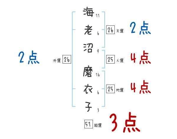 総運![]() | 海老沼磨衣子さんの総運は51画の3つ星!変化が激しく、危険に注意。堅実な性格。 あなたの人生を表す1番重要な運勢です。生涯を通じて影響する総合運となり、主に50歳以降の晩年期に影響を及ぼします。 |