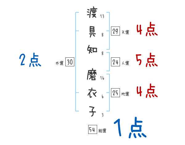 外運![]() | 渡具知磨衣子さんの外運は30画の2つ星!浮き沈みの激しさに注意しましょう。 生活面を象徴する運勢です。外部から受ける影響力を表し、結婚運、家庭運や職場、環境への順応性を表します。 |