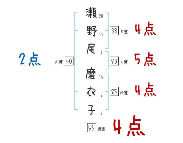 総運![]() | 瀬野尾磨衣子さんの総運は63画の4つ星!家庭運がよく順調な生活。温和な性格。 あなたの人生を表す1番重要な運勢です。生涯を通じて影響する総合運となり、主に50歳以降の晩年期に影響を及ぼします。 |