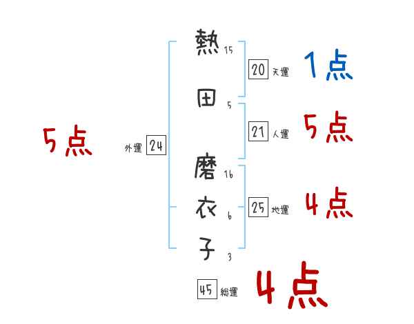 外運![]() | 熱田磨衣子さんの外運は24画の5つ星!家庭運が良く順調な人生。金運にも恵まれる。 生活面を象徴する運勢です。外部から受ける影響力を表し、結婚運、家庭運や職場、環境への順応性を表します。 |