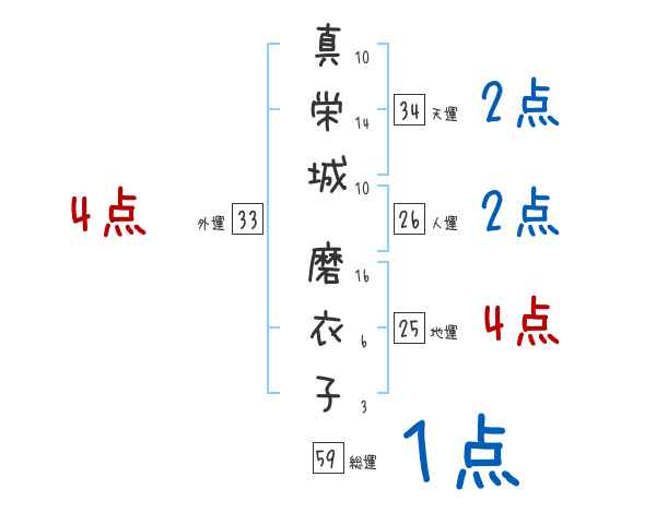 天運![]() | 真栄城磨衣子さんの天運は34画の2つ星!独創性に優れるが、自尊心が強く災難に注意しましょう。 家系が持つ宿命的な運勢を表します。祖先から受け継いだ苗字ですので自分の力が及びません。家柄を象徴します。 |