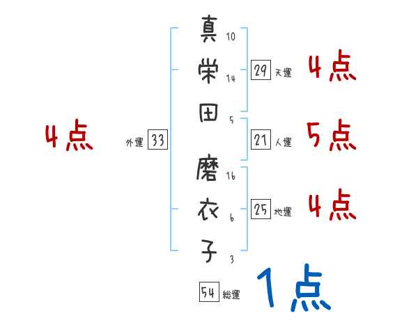 外運![]() | 真栄田磨衣子さんの外運は33画の4つ星!権力志向でプライドが高い。勇気があり運を切り開き成功する。 生活面を象徴する運勢です。外部から受ける影響力を表し、結婚運、家庭運や職場、環境への順応性を表します。 |