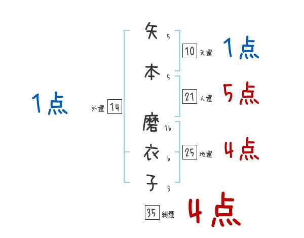 人運![]() | 矢本磨衣子さんの人運は21画の5つ星!統率力がある。独立し成功する。名誉を手に入れる。 性格や才能などを表す2番目に重要な運勢です。人間関係や協調性、社会的な成功に影響します。主に20歳から50歳ぐらいまでの中年期の運勢を表します。 |