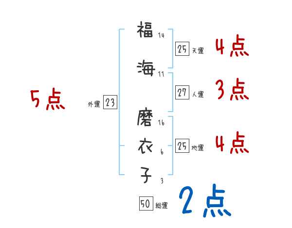 天運![]() | 福海磨衣子さんの天運は25画の4つ星!個性があり才能があふれる。強運の持ち主で発展する。 家系が持つ宿命的な運勢を表します。祖先から受け継いだ苗字ですので自分の力が及びません。家柄を象徴します。 |