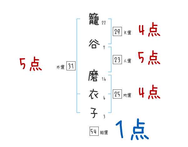 天運![]() | 籠谷磨衣子さんの天運は29画の4つ星!完全主義で才能がある。厳格な心の持ち主。 家系が持つ宿命的な運勢を表します。祖先から受け継いだ苗字ですので自分の力が及びません。家柄を象徴します。 |
