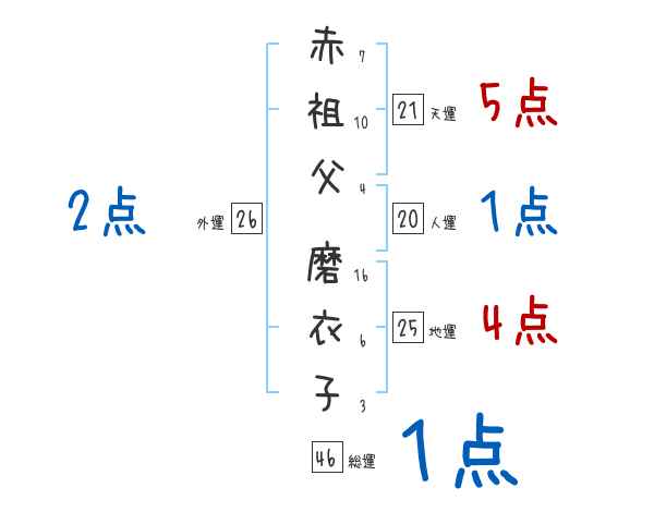 天運![]() | 赤祖父磨衣子さんの天運は21画の5つ星!統率力がある。独立し成功する。名誉を手に入れる。 家系が持つ宿命的な運勢を表します。祖先から受け継いだ苗字ですので自分の力が及びません。家柄を象徴します。 |