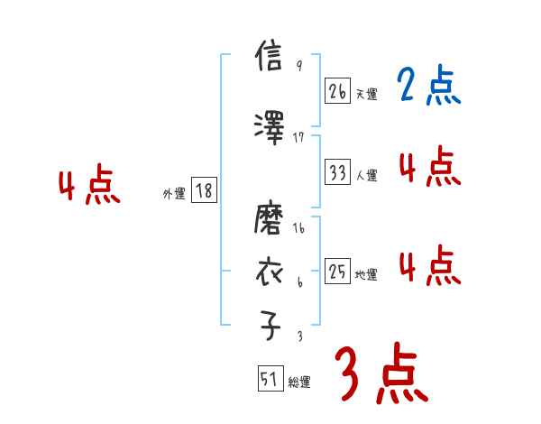 外運![]() | 信澤磨衣子さんの外運は18画の4つ星!情熱的で剛気。忍耐力があり信頼される。 生活面を象徴する運勢です。外部から受ける影響力を表し、結婚運、家庭運や職場、環境への順応性を表します。 |