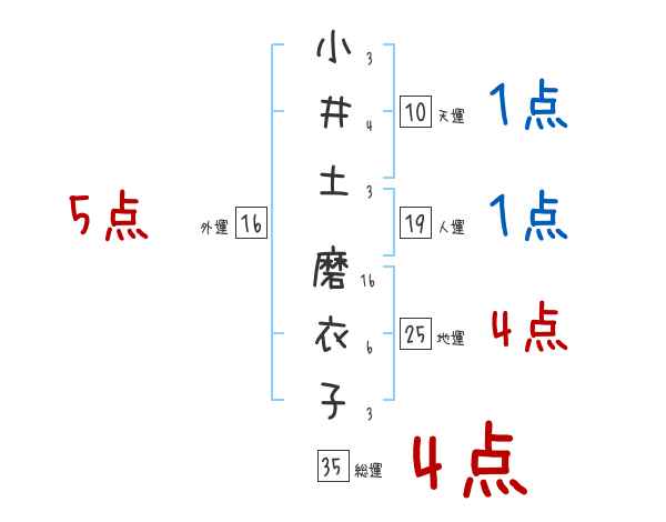 外運![]() | 小井土磨衣子さんの外運は16画の5つ星!人望が厚く大きく発展する。逆転成功が見える。 生活面を象徴する運勢です。外部から受ける影響力を表し、結婚運、家庭運や職場、環境への順応性を表します。 |