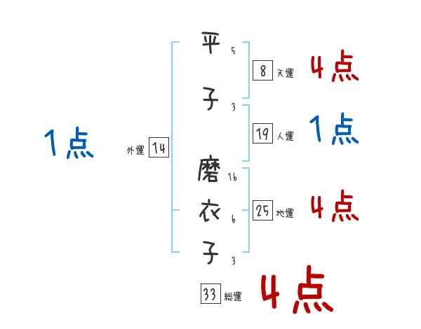 外運![]() | 平子磨衣子さんの外運は14画の1つ星!人に対して優しいがストレスを溜め込みがち。人間関係のトラブルを避けるよう気をつけましょう。 生活面を象徴する運勢です。外部から受ける影響力を表し、結婚運、家庭運や職場、環境への順応性を表します。 |
