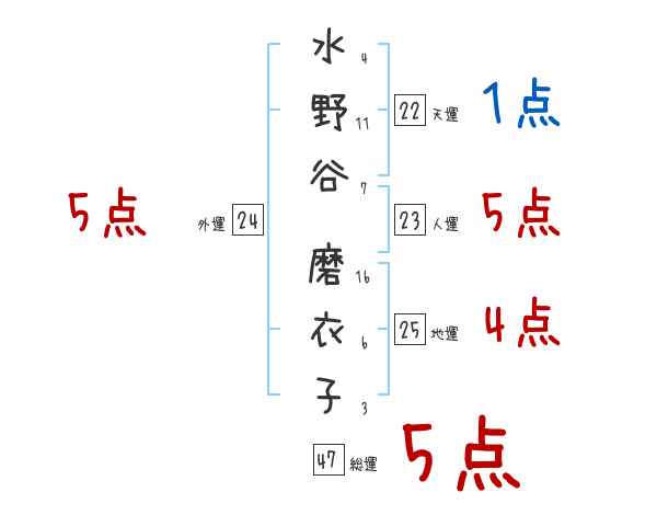 外運![]() | 水野谷磨衣子さんの外運は24画の5つ星!家庭運が良く順調な人生。金運にも恵まれる。 生活面を象徴する運勢です。外部から受ける影響力を表し、結婚運、家庭運や職場、環境への順応性を表します。 |