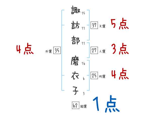 外運![]() | 諏訪部磨衣子さんの外運は35画の4つ星!温厚な性格で感受性が高い。穏和な性格で人望が厚い。 生活面を象徴する運勢です。外部から受ける影響力を表し、結婚運、家庭運や職場、環境への順応性を表します。 |