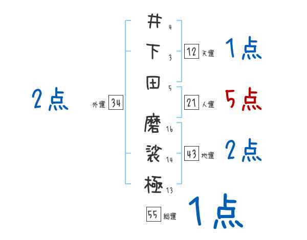 外運![]() | 井下田磨裟極さんの外運は34画の2つ星!独創性に優れるが、自尊心が強く災難に注意しましょう。 生活面を象徴する運勢です。外部から受ける影響力を表し、結婚運、家庭運や職場、環境への順応性を表します。 |