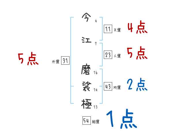 総運![]() | 今江磨裟極さんの総運は54画の1つ星!トラブルが多いかも。周りをよく見て協調して過ごしましょう。 あなたの人生を表す1番重要な運勢です。生涯を通じて影響する総合運となり、主に50歳以降の晩年期に影響を及ぼします。 |