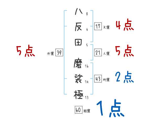 外運![]() | 八反田磨裟極さんの外運は39画の5つ星!社交性に優れ人望が厚い。人の上に立ち成功する。 生活面を象徴する運勢です。外部から受ける影響力を表し、結婚運、家庭運や職場、環境への順応性を表します。 |