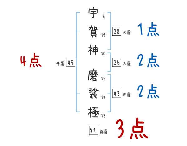 天運![]() | 宇賀神磨裟極さんの天運は28画の1つ星!家庭環境に注意。スポーツで活躍できる能力があるかも。 家系が持つ宿命的な運勢を表します。祖先から受け継いだ苗字ですので自分の力が及びません。家柄を象徴します。 |