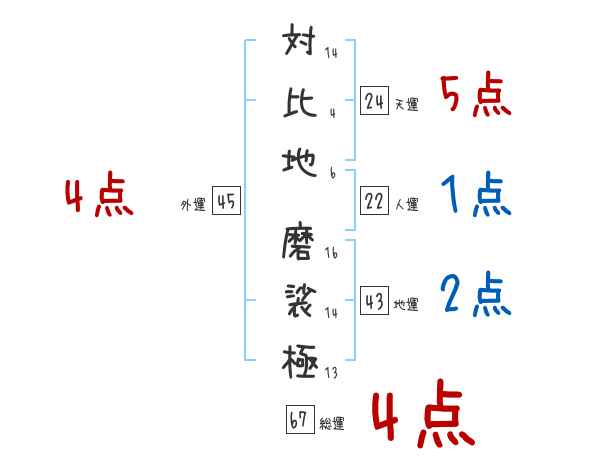 天運![]() | 対比地磨裟極さんの天運は24画の5つ星!家庭運が良く順調な人生。金運にも恵まれる。 家系が持つ宿命的な運勢を表します。祖先から受け継いだ苗字ですので自分の力が及びません。家柄を象徴します。 |