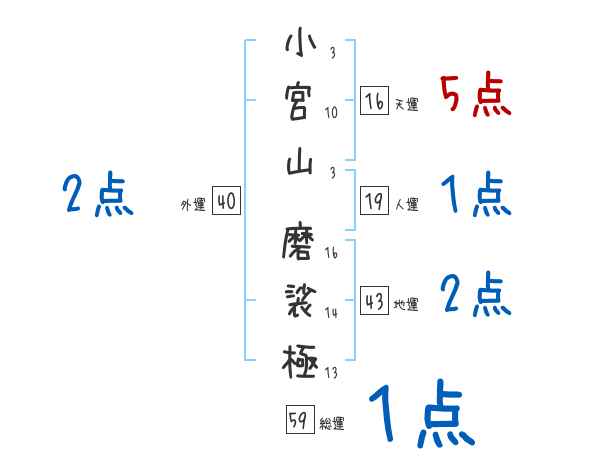 人運![]() | 小宮山磨裟極さんの人運は19画の1つ星!優れた才能を持ちますが、協調性が足りないことも。周りの人と協力する事を意識しましょう。 性格や才能などを表す2番目に重要な運勢です。人間関係や協調性、社会的な成功に影響します。主に20歳から50歳ぐらいまでの中年期の運勢を表します。 |