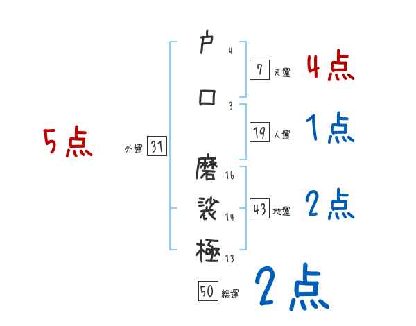 天運![]() | 戸口磨裟極さんの天運は7画の4つ星!強い意志や信念を持ち独立心が強い。自立する。 家系が持つ宿命的な運勢を表します。祖先から受け継いだ苗字ですので自分の力が及びません。家柄を象徴します。 |