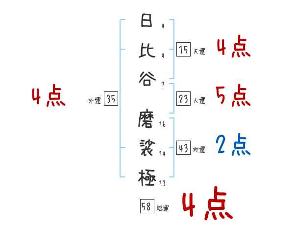 総運![]() | 日比谷磨裟極さんの総運は58画の4つ星!安定した生活。大器晩成タイプ。 あなたの人生を表す1番重要な運勢です。生涯を通じて影響する総合運となり、主に50歳以降の晩年期に影響を及ぼします。 |
