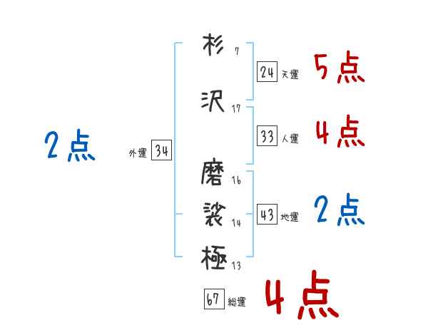 天運![]() | 杉沢磨裟極さんの天運は24画の5つ星!家庭運が良く順調な人生。金運にも恵まれる。 家系が持つ宿命的な運勢を表します。祖先から受け継いだ苗字ですので自分の力が及びません。家柄を象徴します。 |