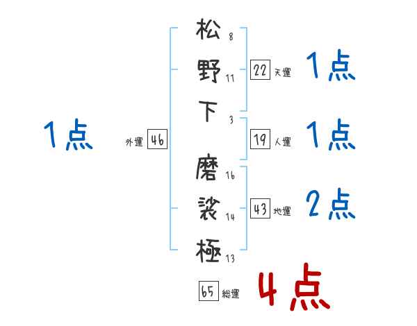 天運![]() | 松野下磨裟極さんの天運は22画の1つ星!努力することが苦手ないっぽう手先が器用。芸術性にも優れる。 家系が持つ宿命的な運勢を表します。祖先から受け継いだ苗字ですので自分の力が及びません。家柄を象徴します。 |
