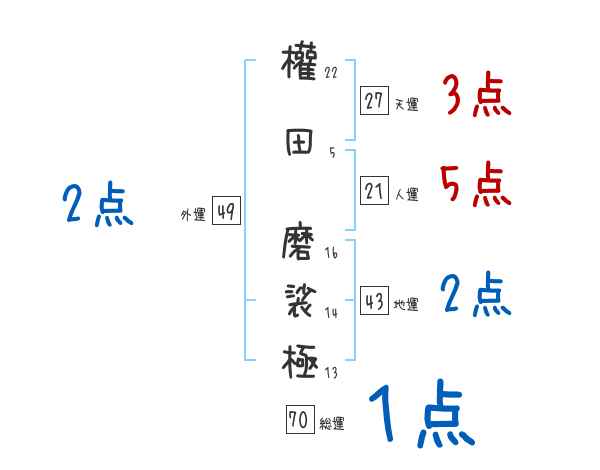 外運![]() | 權田磨裟極さんの外運は49画の2つ星!不安定な性格で明暗がある人生。周りの人には支援されやすい。 生活面を象徴する運勢です。外部から受ける影響力を表し、結婚運、家庭運や職場、環境への順応性を表します。 |