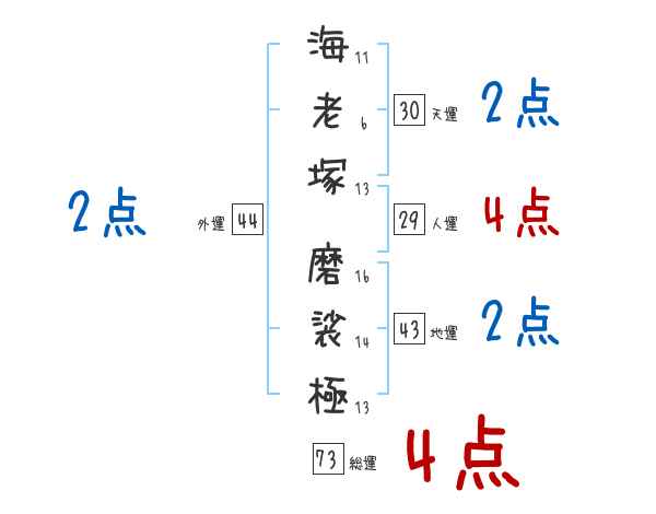 総運![]() | 海老塚磨裟極さんの総運は73画の4つ星!天徳のある人生。散財に注意すれば晩年幸福。 あなたの人生を表す1番重要な運勢です。生涯を通じて影響する総合運となり、主に50歳以降の晩年期に影響を及ぼします。 |