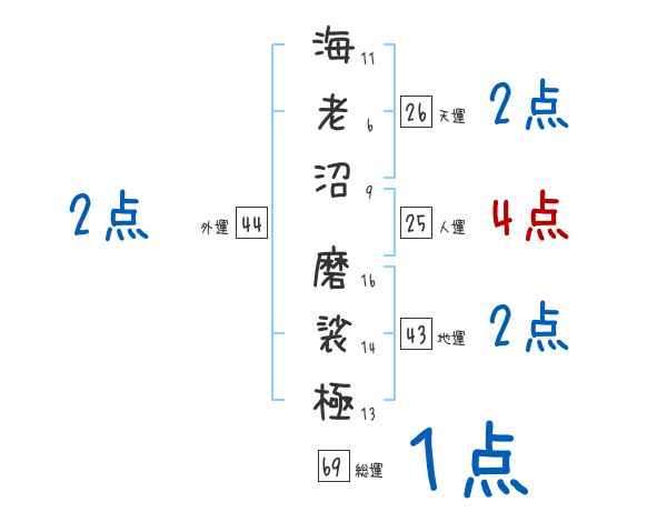 総運![]() | 海老沼磨裟極さんの総運は69画の1つ星!不満を感じやすい傾向が。ストレスを貯めないように注意しましょう。 あなたの人生を表す1番重要な運勢です。生涯を通じて影響する総合運となり、主に50歳以降の晩年期に影響を及ぼします。 |