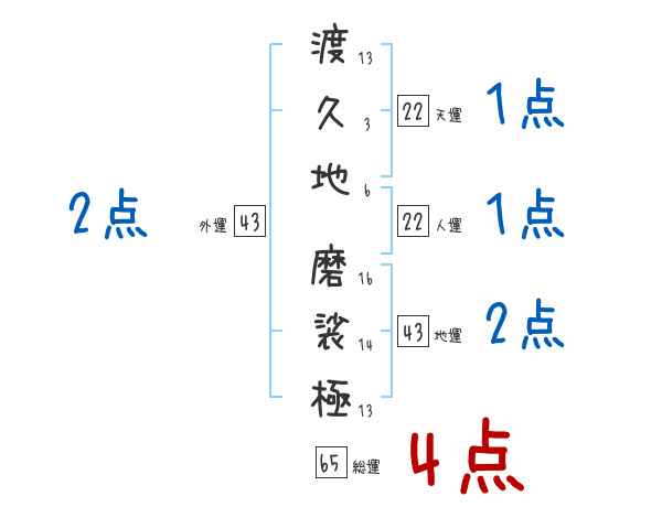 天運![]() | 渡久地磨裟極さんの天運は22画の1つ星!努力することが苦手ないっぽう手先が器用。芸術性にも優れる。 家系が持つ宿命的な運勢を表します。祖先から受け継いだ苗字ですので自分の力が及びません。家柄を象徴します。 |
