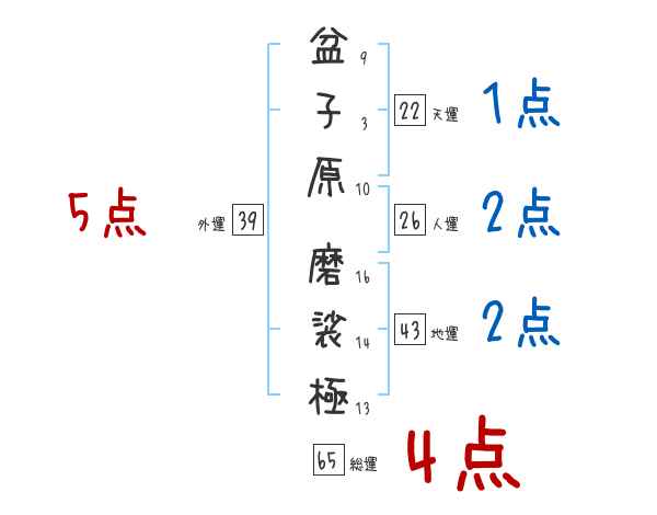 外運![]() | 盆子原磨裟極さんの外運は39画の5つ星!社交性に優れ人望が厚い。人の上に立ち成功する。 生活面を象徴する運勢です。外部から受ける影響力を表し、結婚運、家庭運や職場、環境への順応性を表します。 |