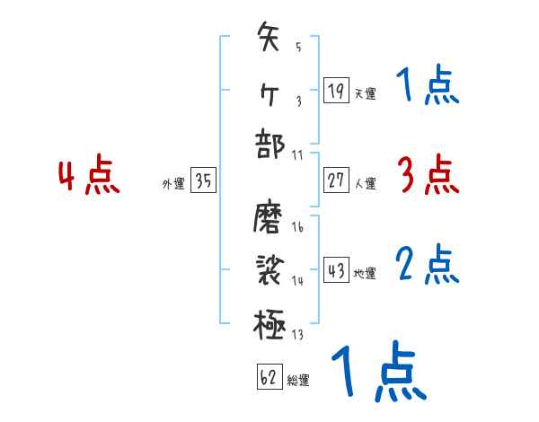 矢ヶ部磨裟極さんの外運は35画の4つ星