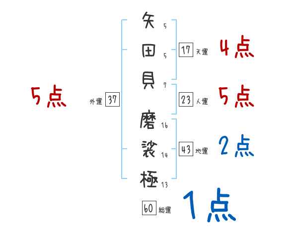 外運![]() | 矢田貝磨裟極さんの外運は37画の5つ星!努力家で順応性に優れる。現実的な考え方ができ忠実に物事をこなす。 生活面を象徴する運勢です。外部から受ける影響力を表し、結婚運、家庭運や職場、環境への順応性を表します。 |