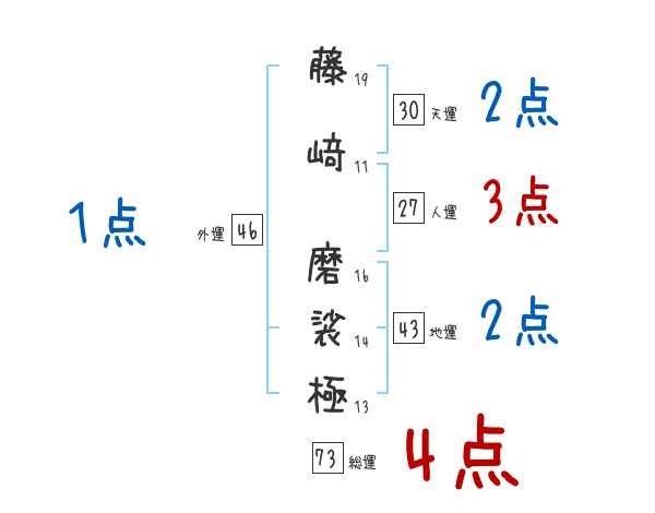 総運![]() | 藤﨑磨裟極さんの総運は73画の4つ星!天徳のある人生。散財に注意すれば晩年幸福。 あなたの人生を表す1番重要な運勢です。生涯を通じて影響する総合運となり、主に50歳以降の晩年期に影響を及ぼします。 |
