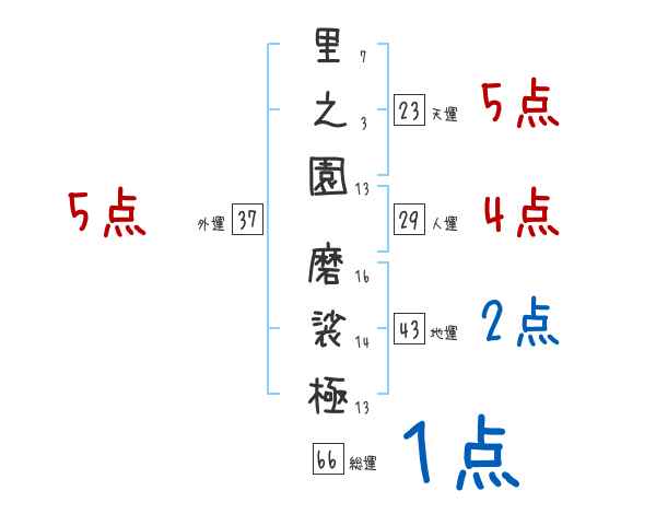 天運![]() | 里之園磨裟極さんの天運は23画の5つ星!想像力に優れ活力がある。一代で成功し名誉を手に入れる。 家系が持つ宿命的な運勢を表します。祖先から受け継いだ苗字ですので自分の力が及びません。家柄を象徴します。 |
