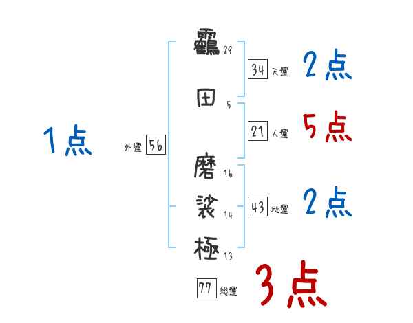 天運![]() | 靏田磨裟極さんの天運は34画の2つ星!独創性に優れるが、自尊心が強く災難に注意しましょう。 家系が持つ宿命的な運勢を表します。祖先から受け継いだ苗字ですので自分の力が及びません。家柄を象徴します。 |