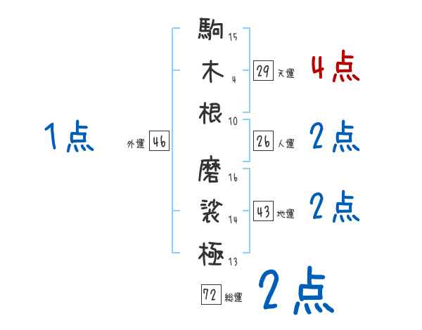 天運![]() | 駒木根磨裟極さんの天運は29画の4つ星!完全主義で才能がある。厳格な心の持ち主。 家系が持つ宿命的な運勢を表します。祖先から受け継いだ苗字ですので自分の力が及びません。家柄を象徴します。 |