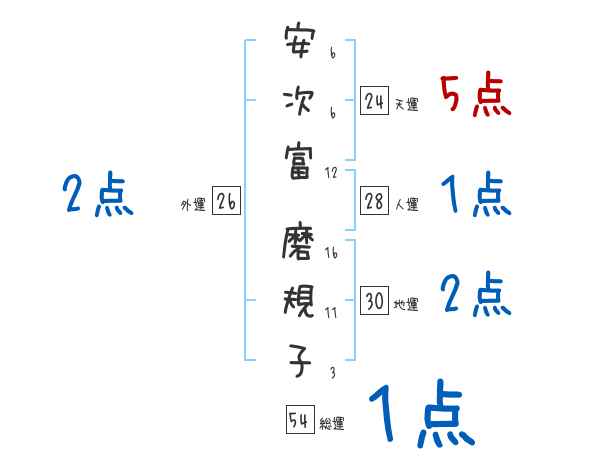 地運![]() | 安次富磨規子さんの地運は30画の2つ星!浮き沈みの激しさに注意しましょう。 個性を表す基礎的な運勢です。性格形成や対人関係、行動力など家庭環境に影響されます。主に誕生してから20歳くらいまでの若年期の運勢を表します。 |
