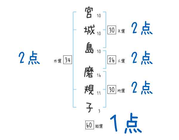 天運![]() | 宮城島磨規子さんの天運は30画の2つ星!浮き沈みの激しさに注意しましょう。 家系が持つ宿命的な運勢を表します。祖先から受け継いだ苗字ですので自分の力が及びません。家柄を象徴します。 |