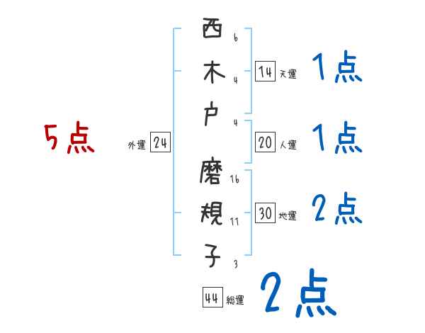 外運![]() | 西木戸磨規子さんの外運は24画の5つ星!家庭運が良く順調な人生。金運にも恵まれる。 生活面を象徴する運勢です。外部から受ける影響力を表し、結婚運、家庭運や職場、環境への順応性を表します。 |