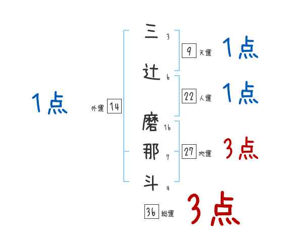 総運![]() | 三辻磨那斗さんの総運は36画の3つ星!先見性が豊かです。多少神経質で苦労することも。 あなたの人生を表す1番重要な運勢です。生涯を通じて影響する総合運となり、主に50歳以降の晩年期に影響を及ぼします。 |