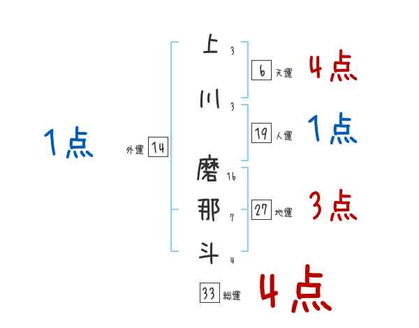 外運![]() | 上川磨那斗さんの外運は14画の1つ星!人に対して優しいがストレスを溜め込みがち。人間関係のトラブルを避けるよう気をつけましょう。 生活面を象徴する運勢です。外部から受ける影響力を表し、結婚運、家庭運や職場、環境への順応性を表します。 |