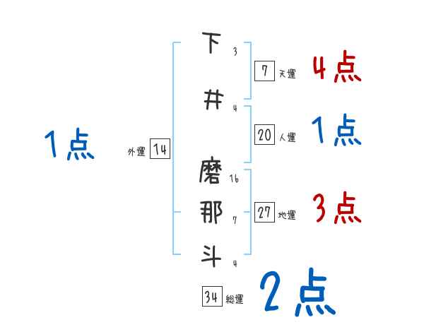 天運![]() | 下井磨那斗さんの天運は7画の4つ星!強い意志や信念を持ち独立心が強い。自立する。 家系が持つ宿命的な運勢を表します。祖先から受け継いだ苗字ですので自分の力が及びません。家柄を象徴します。 |