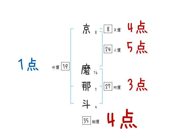 天運![]() | 京磨那斗さんの天運は8画の4つ星!勤勉家。根気強く努力し成功する。忍耐力がある。 家系が持つ宿命的な運勢を表します。祖先から受け継いだ苗字ですので自分の力が及びません。家柄を象徴します。 |