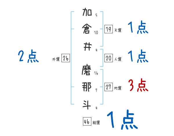 天運![]() | 加倉井磨那斗さんの天運は19画の1つ星!優れた才能を持ちますが、協調性が足りないことも。周りの人と協力する事を意識しましょう。 家系が持つ宿命的な運勢を表します。祖先から受け継いだ苗字ですので自分の力が及びません。家柄を象徴します。 |