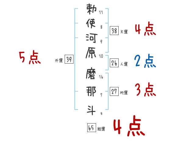 外運![]() | 勅使河原磨那斗さんの外運は39画の5つ星!社交性に優れ人望が厚い。人の上に立ち成功する。 生活面を象徴する運勢です。外部から受ける影響力を表し、結婚運、家庭運や職場、環境への順応性を表します。 |