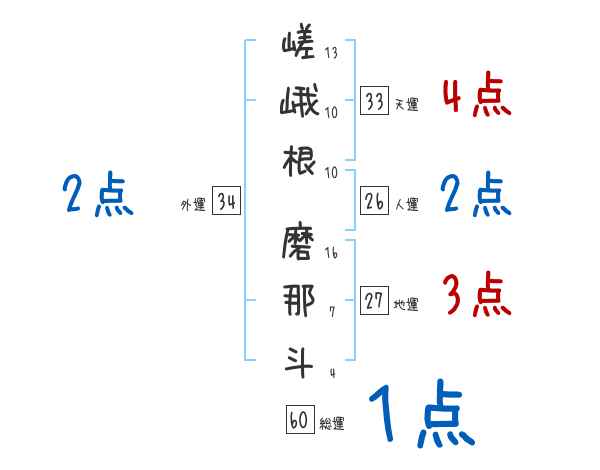 外運![]() | 嵯峨根磨那斗さんの外運は34画の2つ星!独創性に優れるが、自尊心が強く災難に注意しましょう。 生活面を象徴する運勢です。外部から受ける影響力を表し、結婚運、家庭運や職場、環境への順応性を表します。 |